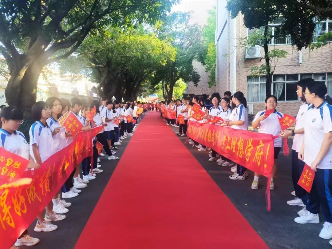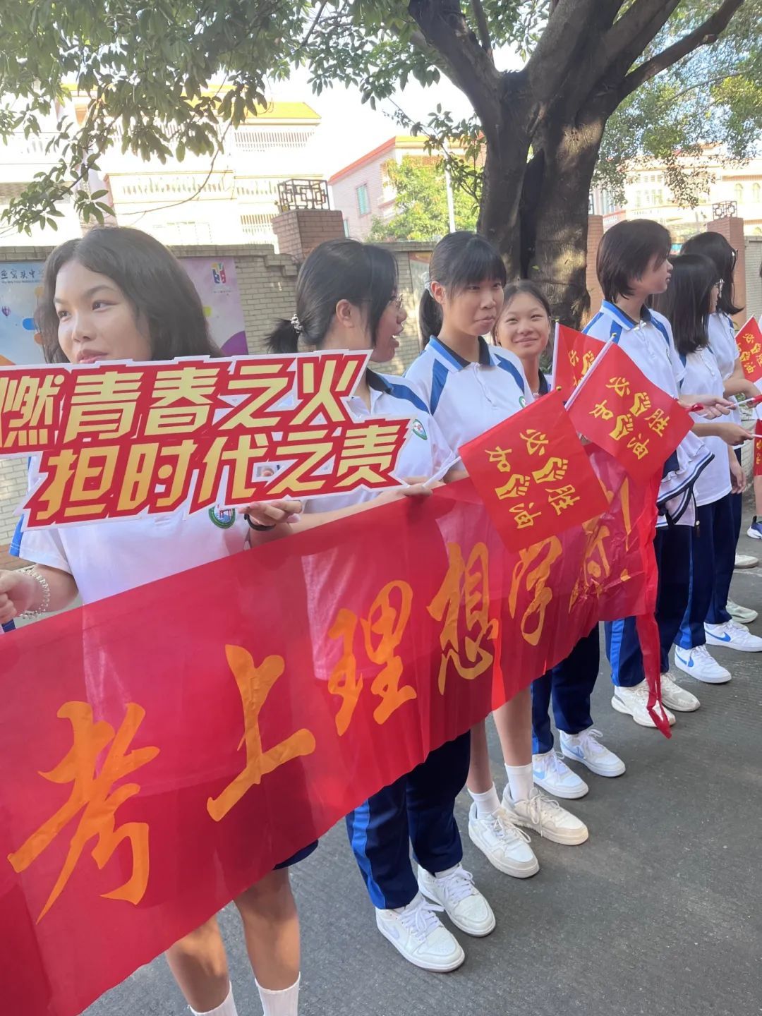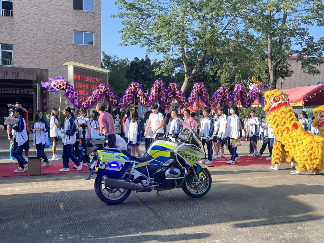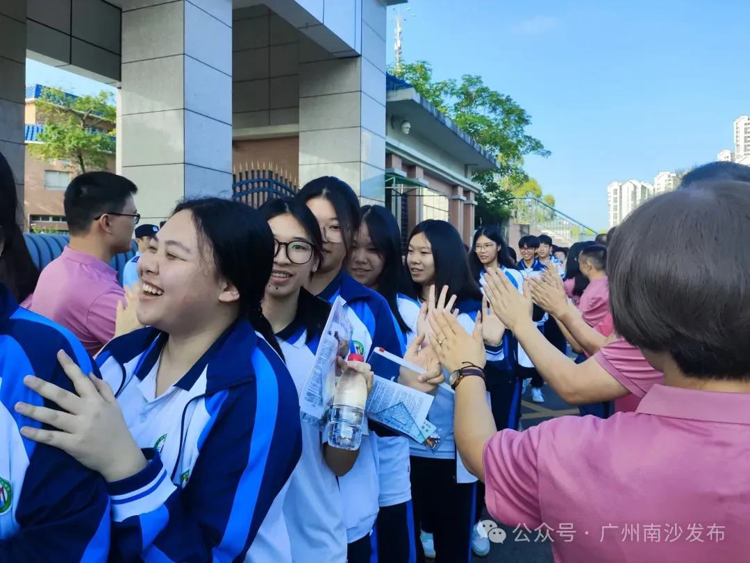 另一边,鱼窝头中学的学子整队出发,临出发前,考生们挨个摸一摸、顶一顶课室门口悬挂的粽子,寓意“一举高中”。为了让考生轻轻松松上考场,学校还准备了舞龙舞狮表演,老师和高一高二的学弟学妹们也一一列队,为考生送上祝福,加油助威!