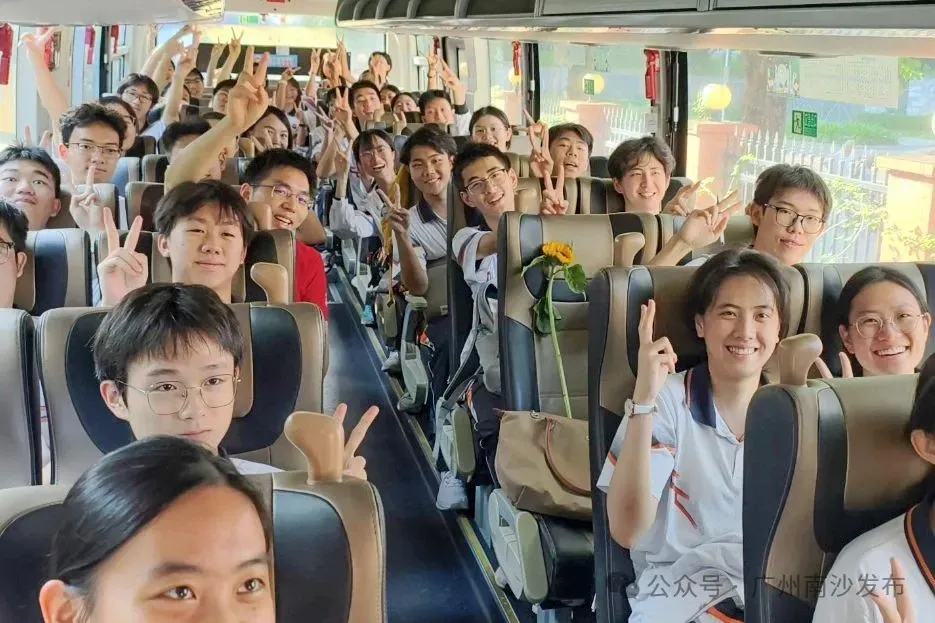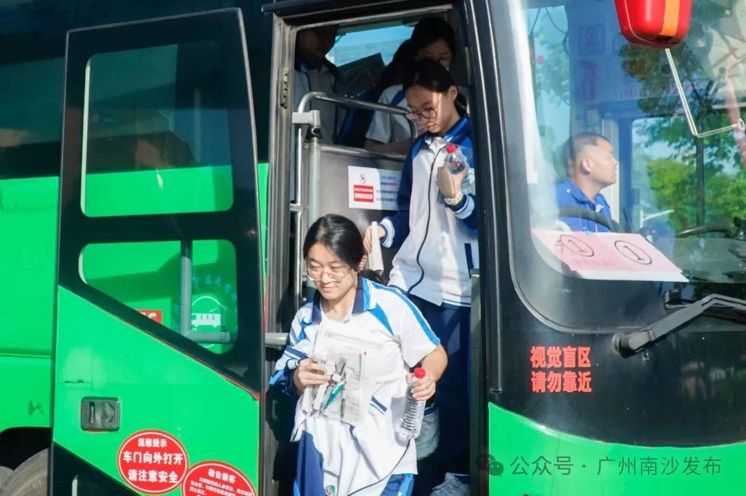 随后,鱼窝头中学的考生陆续乘上送考大巴车奔赴考场。在7时37分左右,鱼窝头中学的送考大巴车队便陆续抵达广州市南沙东涌中学考点。