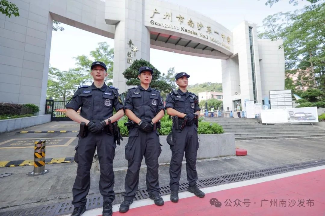 在广州市南沙第一中学(高中部)考点,安保执勤人员在上午7时许已现场就绪,在距离考点大约200米的位置拦路设障,暂停无关车辆和人员入内,为广大考生营造安全有序的考试环境。